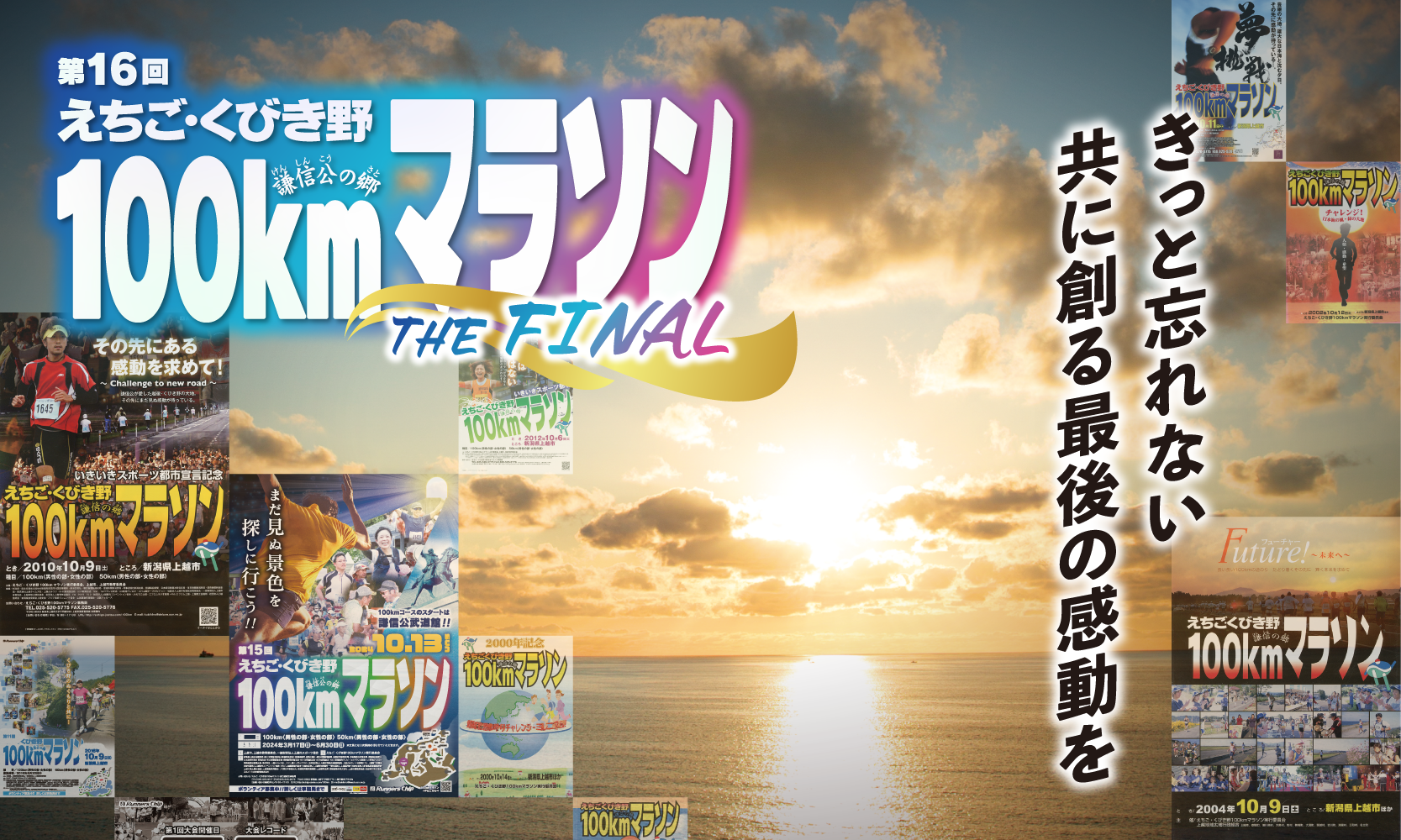 「第16回えちご・くびき野100kmマラソン」のポスター完成!100kmコース76km地点付近の鵜の浜海岸の夕日をバックに、これまでの大会のポスターを散りばめました。 3月上旬から順次、各所へ配布する予定です。ポスターの掲示にご協力いただける事業者様には郵送しますので、希望する場合は大会事務局へご連絡をお願いします。 エントリー受付は3月15日午前0時スタート! 詳細PDFを表示 |